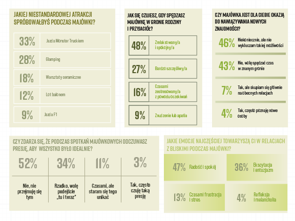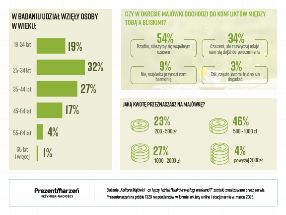 Co więcej, prawie połowa z Was (46%) zawsze bierze dodatkowy urlop, żeby wydłużyć wypoczynek. I słusznie – regeneracja to inwestycja, która zawsze się zwraca. Zapewne, podobnie jak 48% badanych, czujecie się podczas majówki po prostu zrelaksowani i spokojni. Konflikty? Zdarzają się rzadko (u 54%), więc jest szansa na naprawdę udany czas ✌️