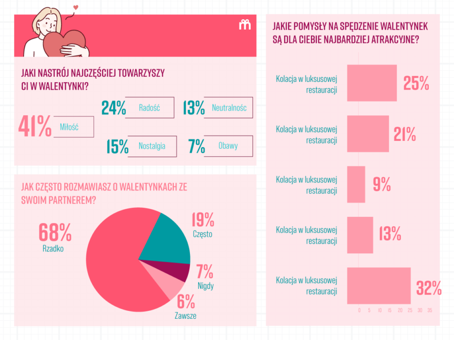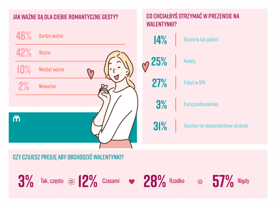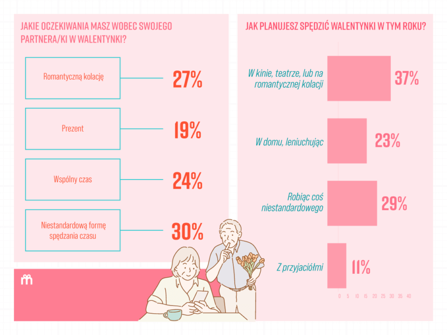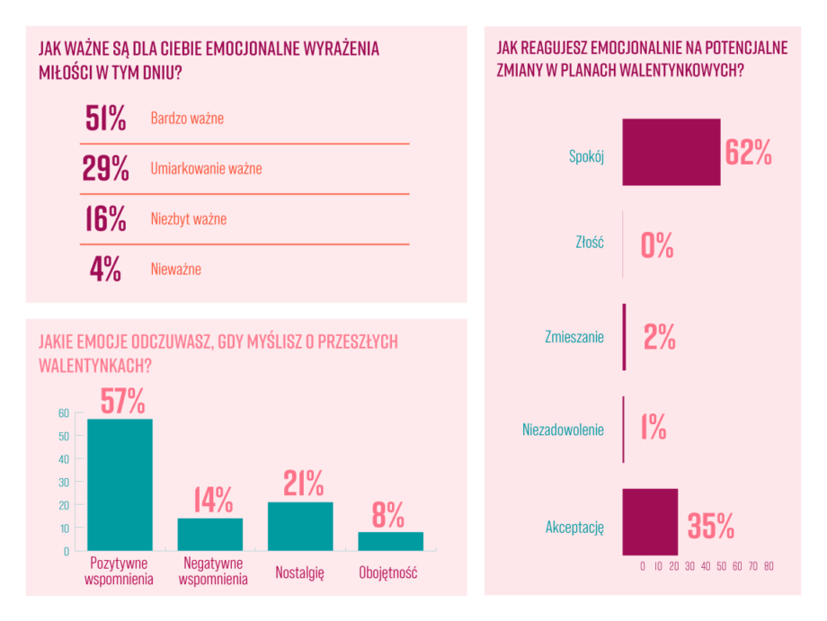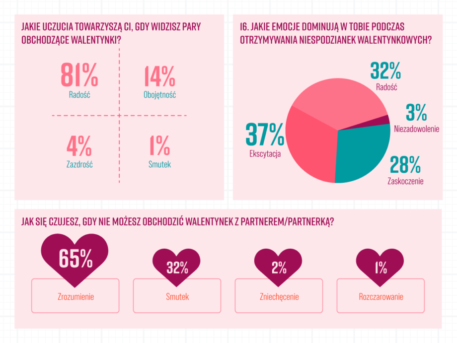 Ciekawostka: Aż 68% par rzadko rozmawia o planach na Walentynki! Czyżby liczyli na domyślność partnera, czy może lubią dreszczyk niespodzianki? Biorąc pod uwagę, że niespodzianki wywołują u badanych głównie ekscytację (37%) i radość (32%), element zaskoczenia jest jak najbardziej wskazany 😉