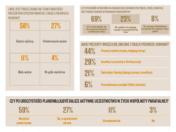 Przejdźmy do konkretów, które budzą największe emocje. Czy prezenty są ważne? Dla 58% z Was – bardzo. I choć 16% badanych uważa, że komunia stała się zbyt komercyjna, to jednak chcemy, żeby dziecko miało z tego dnia coś trwałego 💰