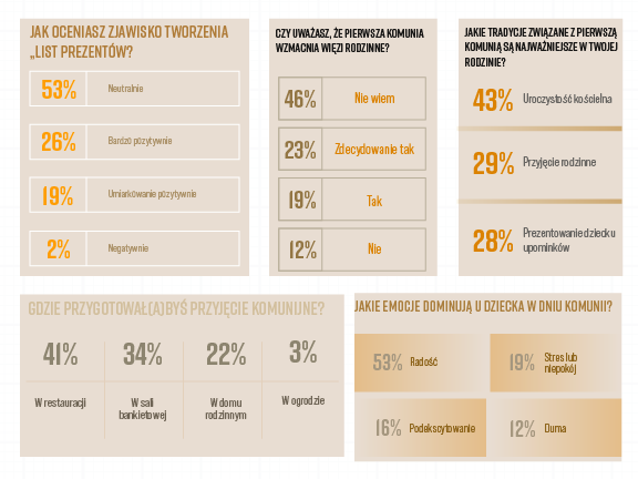 W całej tej gonitwie za najlepszą salą i wymarzonym prezentem, zapominamy czasem o relacjach. Co ciekawe, aż 46% z Was nie ma pewności, czy Pierwsza Komunia faktycznie wzmacnia więzi rodzinne. Z drugiej strony, dla dziecka to dzień ogromnych emocji – przede wszystkim radości (53%) i dumy, choć stres puka do drzwi co piątego dziecka ✨