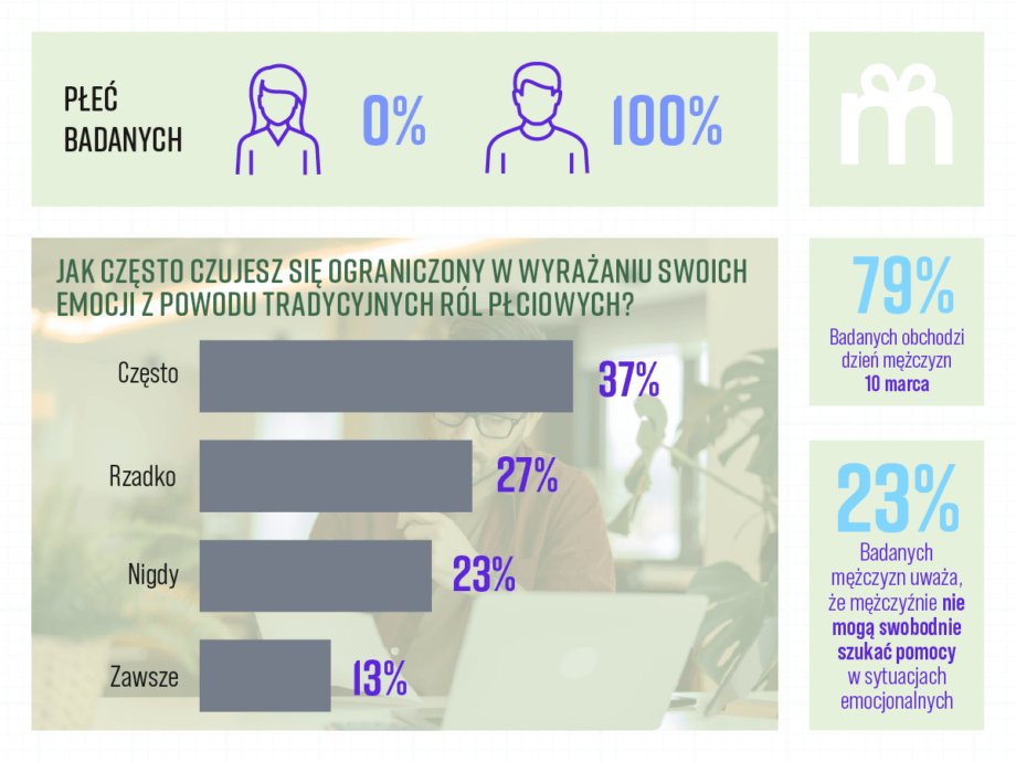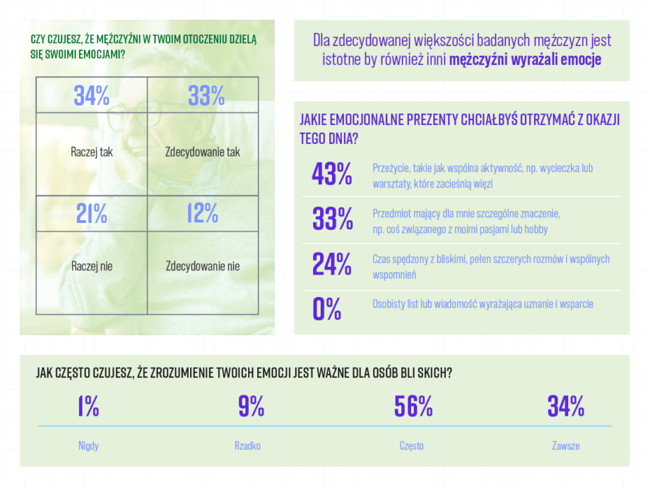 - Aż 50% często lub zawsze czuje się ograniczonych w okazywaniu uczuć z powodu tradycyjnych ról płciowych.