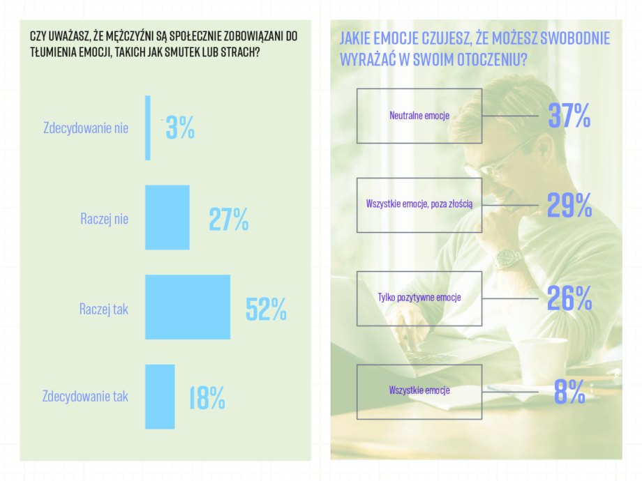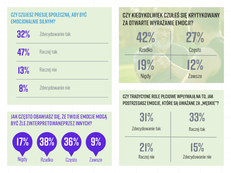 - 70% uważa, że są społecznie zobowiązani do tłumienia smutku czy strachu.