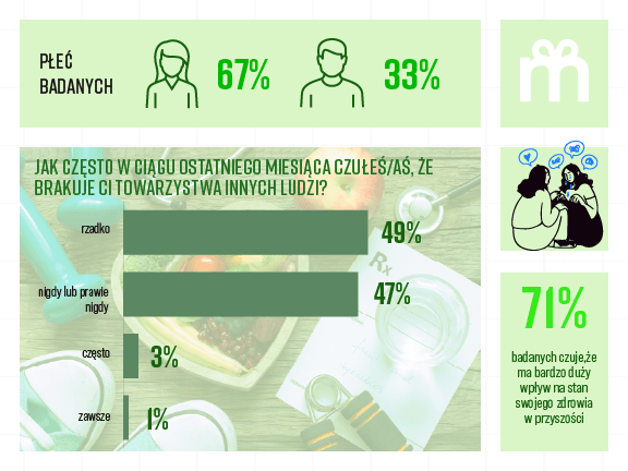 Co więcej, prawie nigdy nie czujemy, że brakuje nam towarzystwa (96% odpowiedzi „rzadko” lub „nigdy”). Gdy dopada nas stres lub trudne emocje, 45% wybiera najlepszy, darmowy lek świata – rozmowę z bliską osobą. (Dopiero na trzecim i czwartym miejscu jest ucieczka w ekrany – 28%, i aktywność fizyczna – 24%).