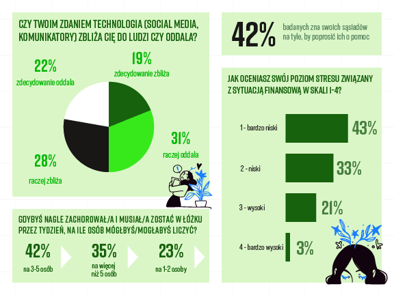 A wiecie, co jest najbardziej budujące? Gdyby nagle dopadła nas choroba i zatrzymała w łóżku na tydzień, aż 77% z nas mogłoby liczyć na pomoc od 3 do nawet ponad 5 osób! Nasz kapitał społeczny ma się świetnie.