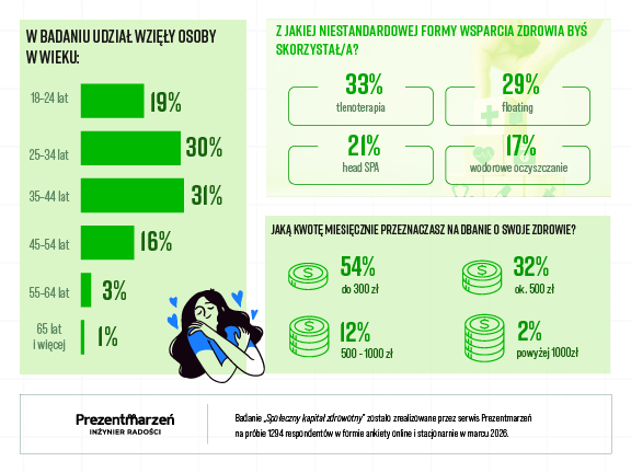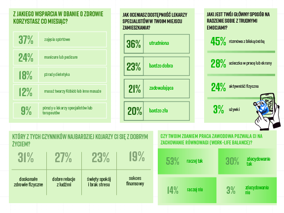 W sondzie o społecznym kapitale zdrowotnym zapytaliśmy o nawyki, obawy i sposoby na relaks. Wyniki? Są ciekawe i udowadniają jedno – mamy w sobie ogromną siłę, choć czasem brakuje nam na to wszystko budżetu 😉