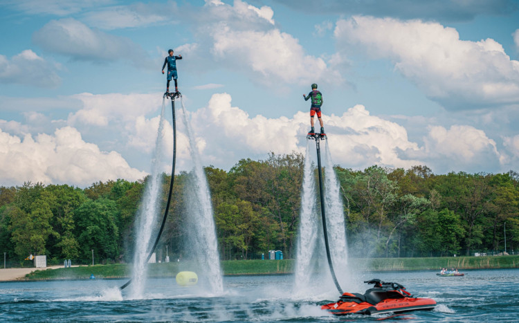 Flyboard to innowacyjny sport wodny, który umożliwia unoszenie się nad powierzchnią wody dzięki specjalnym butom z dyszami połączonymi ze skuterem wodnym. Strumień wody wyrzucany pod dużym ciśnieniem pozwala wzbić się na wysokość nawet do 10 metrów. Utrzymanie równowagi jest wyzwaniem, ale z każdą chwilą staje się coraz łatwiejsze, co daje ogromną satysfakcję. Atrakcja w Poznaniu przeznaczona jest dla dwóch osób – każda z nich odbędzie 15-minutowy lot, a nad przebiegiem całej zabawy czuwa doświadczony instruktor. Przed startem uczestnicy przechodzą krótkie szkolenie obejmujące zasady bezpieczeństwa i obsługę sprzętu. Kamizelka asekuracyjna i kask zapewniają dodatkową ochronę, dzięki czemu można skupić się wyłącznie na czerpaniu radości z lotu. Flyboard w Poznaniu to niezapomniane przeżycie i widowiskowa przygoda, która na długo zapada w pamięć.