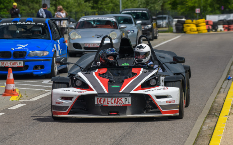 Jazda za kierownicą KTM X-BOW realizowana podczas eventu motoryzacyjnego na Torze Wrocław-Krzywa. W jeździe uczestniczy instruktor, który siedzi na miejscu pasażera i kontroluje prawidłowy i bezpieczny przebieg atrakcji.