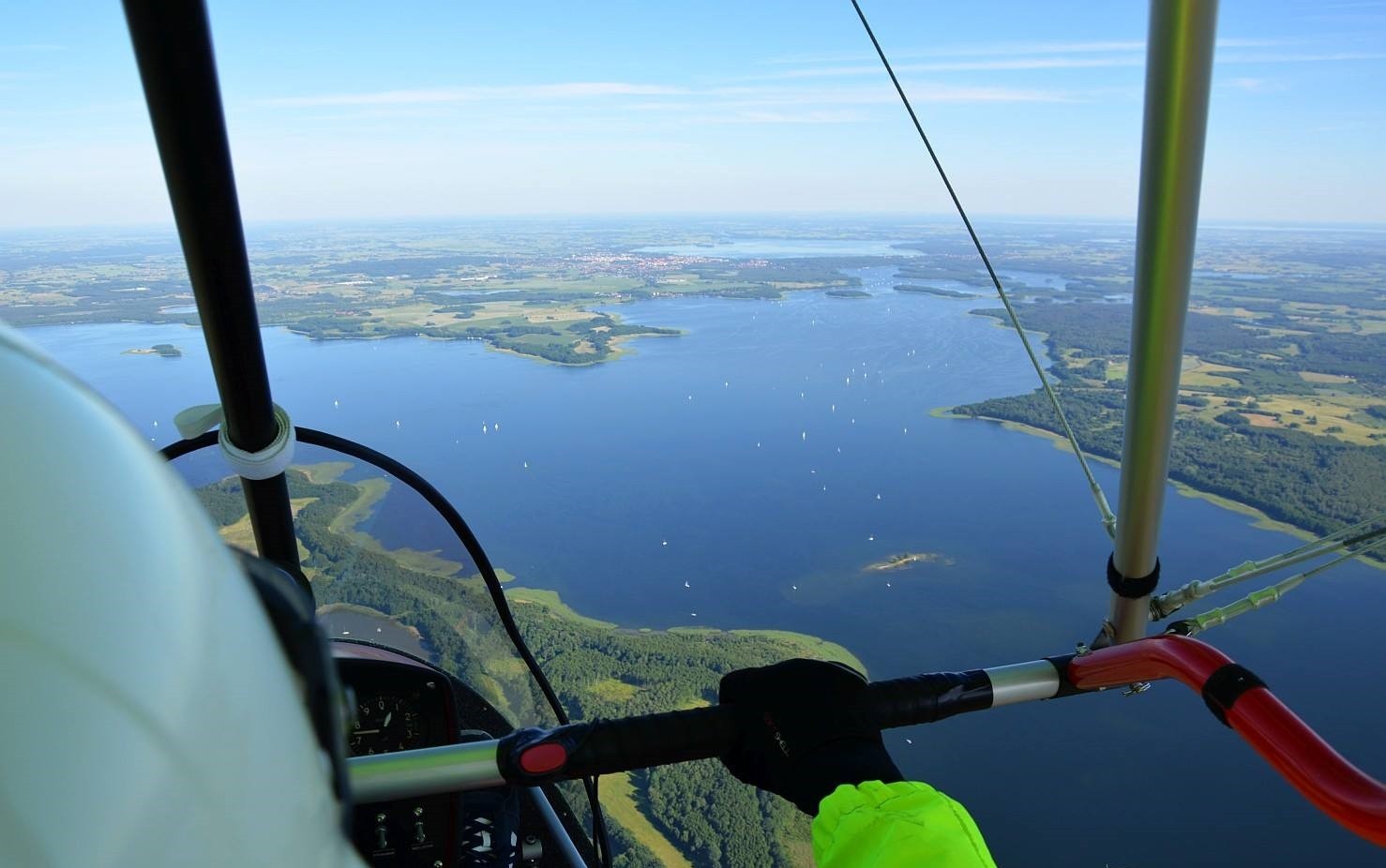 Widokowy lot motolotnią nad Mazurami w okolicy Giżycka to niezwykłe doświadczenie, które łączy relaks z nutą adrenaliny. Start realizowany jest z lądowiska Dejguny, skąd motolotnia dynamicznie wznosi się z prędkością pionową 3–5 m/s, osiągając 100 metrów wysokości już w 20–25 sekund od oderwania się od ziemi. Podczas lotu uczestnicy unoszą się na wysokości od 250 do 500 metrów, podziwiając rozległe tafle jezior, zielone lasy i charakterystyczny mazurski krajobraz. Lot ma charakter rekreacyjny i widokowy, dzięki czemu pozwala w pełni skupić się na widokach i wspólnym przeżywaniu chwili. W opcji dla dwojga loty odbywają się jednocześnie – na dwóch motolotniach lecących obok siebie. To wyjątkowa możliwość dzielenia emocji w czasie rzeczywistym i obserwowania siebie nawzajem w powietrzu.