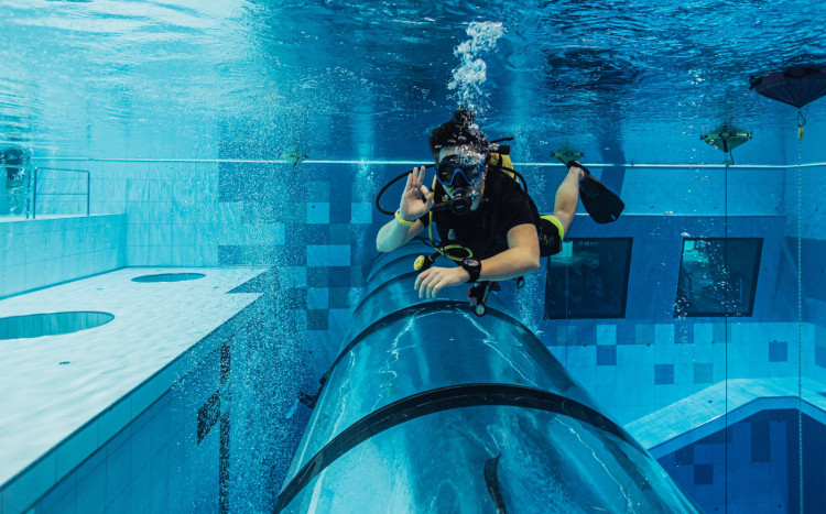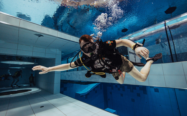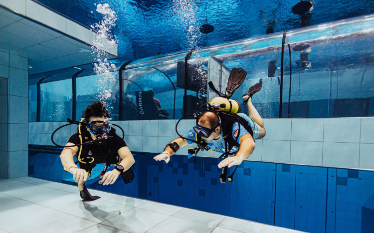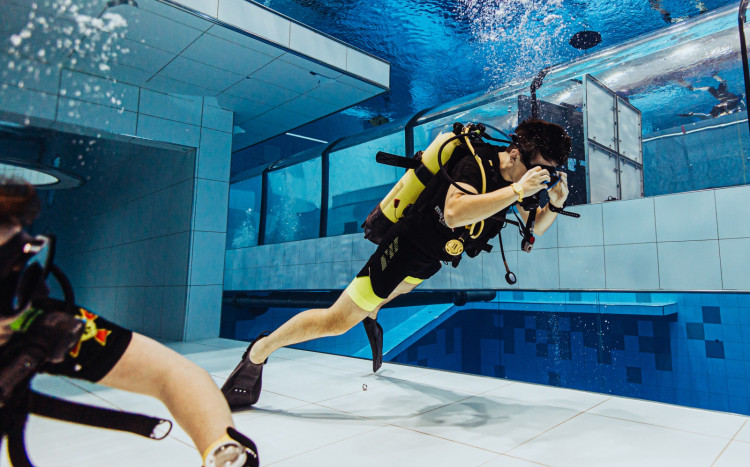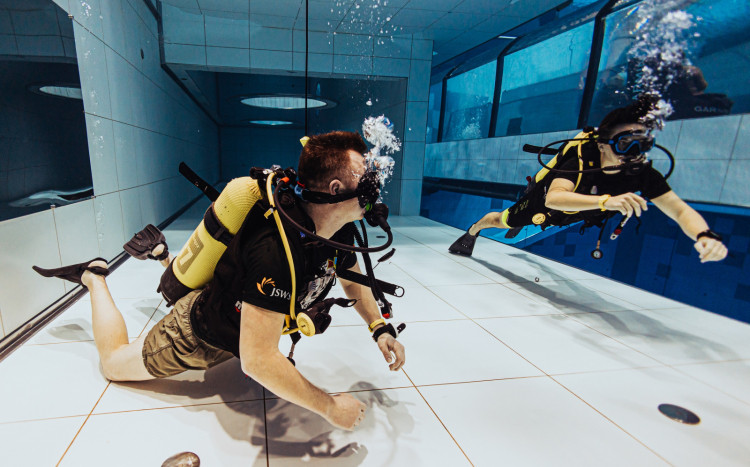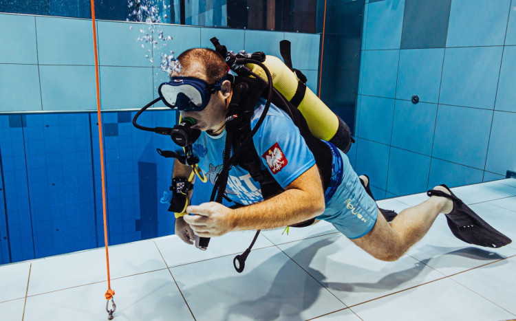Zapoznawcza lekcja nurkowania dla 2 osób w basenie niedaleko Gliwic. Zajęcia trwają około 2 godziny i obejmują część teoretyczną oraz praktyczne nurkowanie pod opieką instruktora.