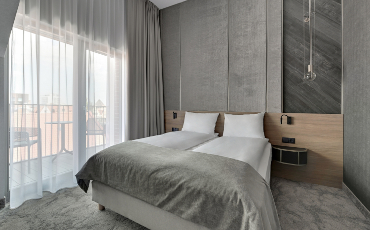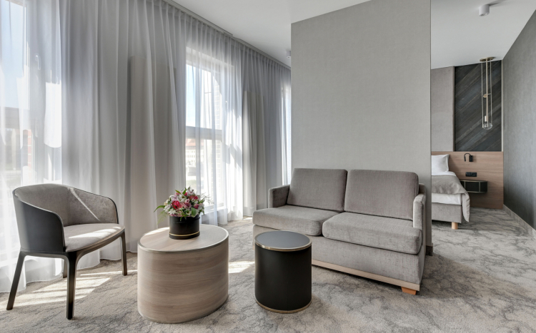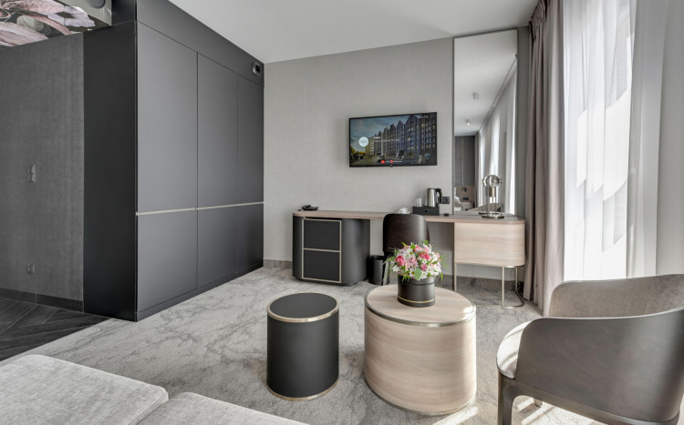 Typ pokoju: Studio Double (32 m2) – wyposażony w łóżko dwuosobowe oraz rozkładaną sofę. W pokoju znajduje się łazienka urządzona w eleganckim stylu, zaopatrzona w przybory toaletowe, szlafrok, ręczniki oraz suszarkę. Część dzienna została oddzielona od sypialni ścianką. Na wyposażeniu znajduje się również zestaw do parzenia kawy i herbaty oraz minibar.