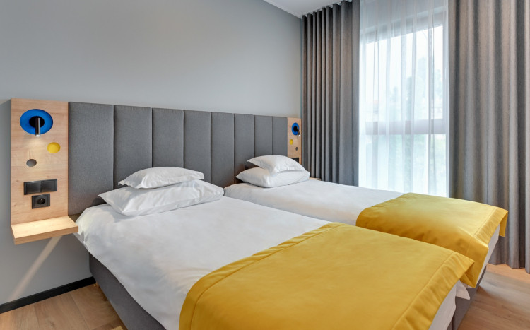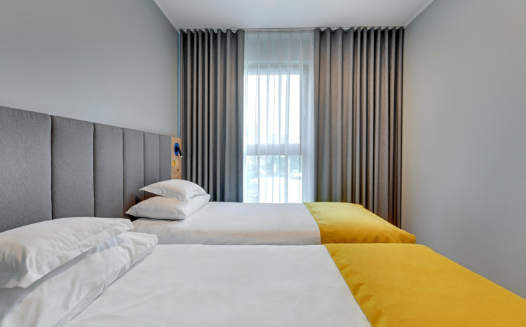 W sypialni znajdują się dwa osobne łóżka o szerokości 90 cm, natomiast w salonie dwuosobowa, rozkładana sof