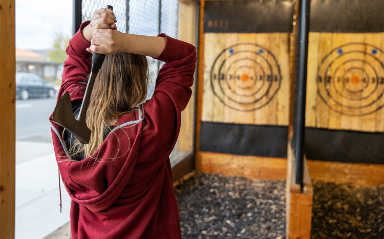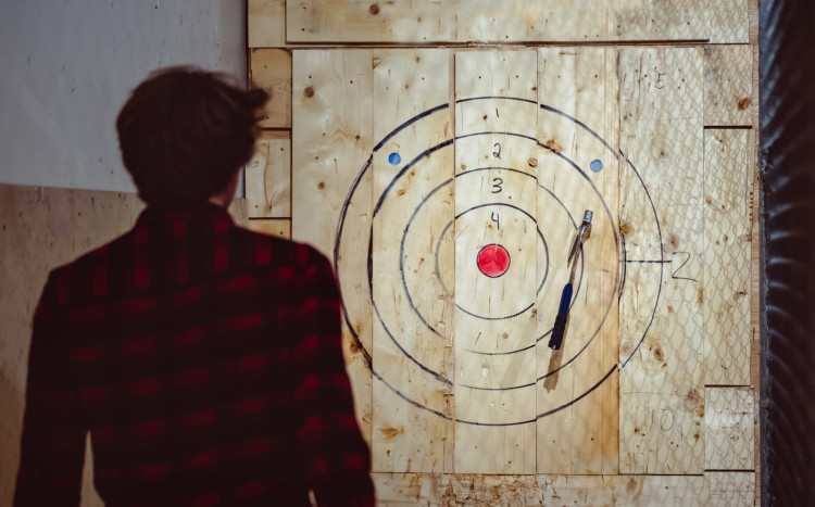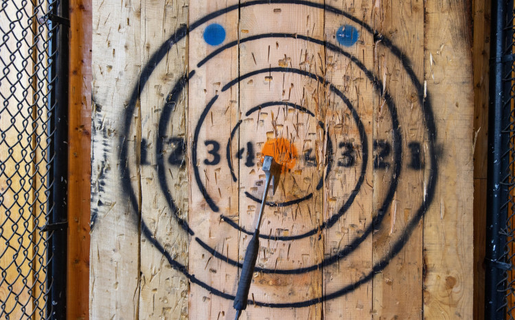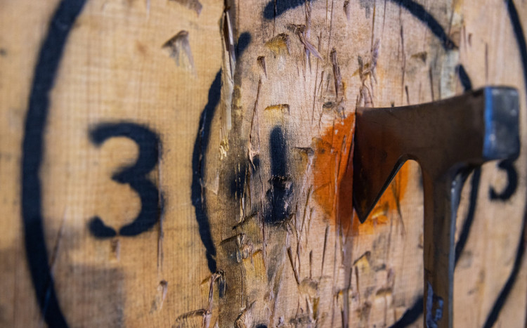 Rzucanie toporami do tarczy w Wiking Club - Axe Throwing we Wrocławiu. W zależności od wybranej opcji gra przeznaczona jest dla 2, 4 lub 8 osób i różni się czasem trwania.