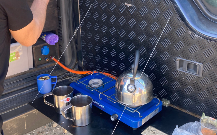 wypożyczenie auta z kompletnym wyposażeniem biwakowym (prysznic z ciepłą wodą, turystyczna kabina prysznicowa, namiot dachowy, dodatkowy namiot 2-osobowy, karimata 2 szt., kuchenka gazowa, zestaw naczyń oraz sztućców, stolik i krzesła),